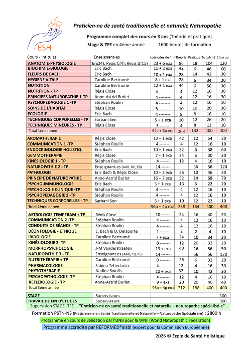Le programme des cours de Praticien(ne) en Santé Traditionnelle et Naturelle Naturopathe (PSTN-N) est accrédité par REFORMED® (depuis 2014), ce qui lui confère une validité européenne et même internationale.